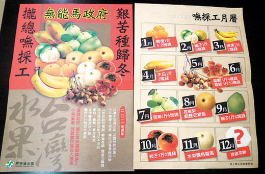 「柿子一斤2塊錢」,沒有說是哪種柿子,後來才說是牛心柿,可是...圖片上的確就是甜柿;11月「水梨價格直直落」,拜託...水梨是9-10月上市,11月上市的是雪梨。我發現更大的陰謀,不知道該不該說?月曆上大多不是南部的水果耶= = 可能我大哥二姐他們的票不重要吧?