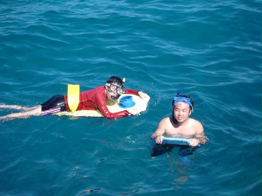 在離開的前夕,他終於願意開始玩水,來夏威夷快要一年卻沒去過海邊游泳,我想這樣的人應該很少,但有些人就是天生水性不佳,怕水也就浪費玩水的樂趣。海邊泡水、用浮板滑水跟跳下船去浮潛,困難度一次比一次高,雖然我會游泳但是也感受相當的壓力,在深達22呎以上的海中浮潛,果然是有樂趣跟魔力的,至少勇於嘗試和克服心中的恐懼。