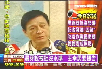 民進黨立委王幸男,說總統府發言人王郁琦的暴牙讓人看了就覺得難過,應該整一整,引發爭議,認為他是人身攻擊,還有平面媒體痛批他是「低級立委」,今天王幸男火力不減,說要告媒體,因為他堅持自己沒有人身攻擊,而是認為身為發言人,本來就應該注意形象,他只是提出客觀的建議而已。 民進黨立委王幸男(98.05.26):「光是看到你那張臉,實在很難過。」 王幸男批評總統府發言人王郁琦的暴牙,反被痛批人身攻擊,過了一天,王幸男仍然堅持自己沒有錯。王幸男:「一個人過了40歲以後,一定要為他自己的相貌負責,台灣國家的發言人,你是一個國家的化妝師,我建議他自己要先化妝自己。」 認為自己只是善意提出建議,但是用外貌來評鑑發言人給人的觀感,還是讓許多人看不下去,有平面媒體直接評論「這樣低級的立委」,指出諷刺長相,是很不禮貌的事情。王幸男:「有的人在批評說,我是低級立委,蘋果日報我要告他,還有說我做人身攻擊。」 堅持針砭別人外表沒錯,被別人批評言行失當就要提告,什麼是建議?什麼是批評?王幸男有雙重標準。 失言紀錄不少 王幸男發言頻惹爭議 今天又有民進黨立委失言了;立委王幸男原本針對總統府發言人王郁琦,對於南韓前總統盧武鉉自殺回應作評論,沒想到他天外飛來一筆,批評起王郁琦的外表,還要他去整形;被批評的王郁琦平常心看待,不過有藍營立委看不下去,抨擊王幸男做人身攻擊,問政不理性;回顧過去,王幸男還曾經激烈說出,319槍擊案嫌犯陳義雄的家人「人人得而誅之」,失言紀錄已經不是第一次。 就是這段脫稿演出,引發爭議。民進黨立委王幸男:「你王郁琦一口大爆牙這麼大,你也稍微讓牙醫整形整容,讓人家覺得一位要代表中華民國,常常代表總統府,代表總統講話,光是看到你那張臉實在很難過。」 王幸男評論總統府發言人王郁琦,對於南韓前總統盧武鉉自殺事件的發言表現,卻天外飛來一筆,扯上人家的外表,王幸男說是好心建議,不過藍營立委可看不下去。 國民黨立委洪秀柱:「這個還不只是以貌取人,他是對一個人的人身攻擊,難不成發言人都要是花瓶?」國民黨立委周守訓:「在馬總統出訪前,王郁琦當了犧牲品。」 盧武鉉自殺跟王郁琦外表有什麼關係?王幸男的聯想讓大家開了眼界,當事人王郁琦聽了只能苦笑。總統府發言人王郁琦:「聽到這種東西,笑笑過去就算了。」 這次拿別人外貌開刀,其實王幸男曾經意外點燃的戰火還不止這一樁。民進黨立委 王幸男(95.3.13):「(陳義雄家人)人人得而誅之。」 不滿319涉案人陳義雄家屬翻供,王幸男說重話,還揚言包圍陳家;同樣被社會輿論撻伐的,還有他提案的「228及戒嚴時期政府違法責任追究條例草案」第四條,寫到「被告如果死亡,應命被告配偶或直系旁系三等親,代為訴訟的權利」,「應命」2個字有約束力,被藍營咬定是株連九族條款,當時引發極大爭議;幾起風波,讓王幸男的人格特質,再受關注! |