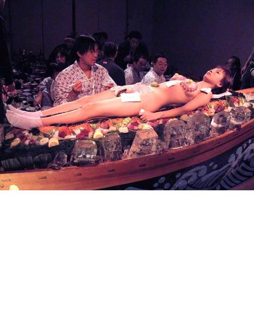 據介紹,在一個全裸的「女體盛」藝伎身上吃一頓馬林魚、鮪魚、