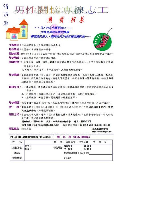 內 政部 男性關懷專線 99年度志工 報 名 表 (請以正楷填寫)