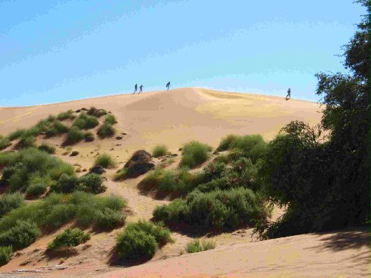 真的,沙漠有風,風像海水一樣,會把地面的沙吹成一波一波,留下優雅的曲線,就像海浪打上岸,在沙灘上留下的痕跡一樣。風不斷吹,沙浪也不斷變換曲線的弧度,變換隊型;風勢小、地勢平坦的地方,風的藝術創作是「沙浪」,風勢大、地勢崎嶇的地方,風的作品就成了「沙丘」,一座一座的沙丘,有的高兩、三百公尺,非常壯觀。