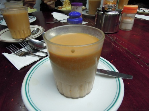 在香港的最後一天,我們利用最後一點空檔,到中環半山電梯踅了一圈,中午就在許多旅遊書和部落格推介的「蘭芳園」用餐。我點了一盤撈丁和一杯熱奶茶。旅遊書上寫道──沒喝過蘭芳園的絲襪奶茶,不算到過香港。──既然如此,豈可錯過?即使訪港多次,還是拍張相片做為到過香港的憑證唄!