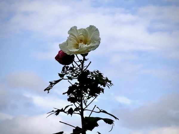 象山頂上,有株醉芙蓉,一朵雪白盛放,另蕊已然閉合,一白一紅,一開一謝,呈現的是生命截然的景觀。