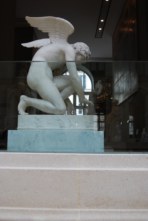 進入羅浮宮展場,感覺像是一列從郊區起站駛入市區的地鐵,原本空蕩蕩的車廂,諸神陸續上車了:啊,維納斯站在那兒,幾步路外,普西莎&愛神在纏綿,還有更多更多的大理石雕像,在穿透玻璃金字塔的完美光線下或站或坐,又或者悠閒躺臥。