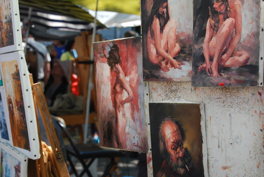 走走逛逛,看到一幅甩頭公雞被畫得律動感十足,還看到裸女圖有些自憐地堆疊﹍。蒙馬特市集,還有街頭表演,高亢的女聲,又拉又唱,拉丁青年吧在那兒越唱越起勁。