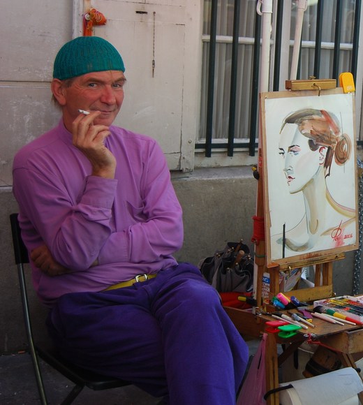繞到白教堂身後,那是個藝術小集,有街頭畫家現畫現賣,也有現場素描,我走走停停,卻發現畫家比畫有趣多了。噢,那個悠閒撚煙的紫衣畫家,一時之間竟讓我跌入了<追憶似水年華>裡公爵和小裁縫的調情,那嬉遊的神態有如一隻翹屁股的驕傲公雞。
