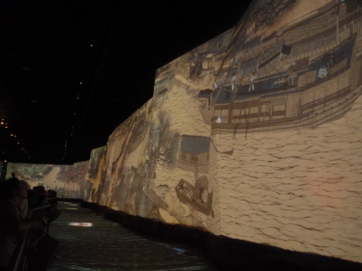 清明上河圖如卷軸般向前開展,山坡水道上人影幢幢,還有拉伕牽船過拱橋的吆喝聲,我跟著馬蹄聲上坡下坡,一瞬間,日景轉換為夜景,我又站著看一會兒老頭下棋,走過橋下,順著馬蹄聲走過城門,咦,怪哉!人怎麼不見了?再盯會兒,一隊駱駝商隊進城來,倒是三步兩步就從城門的另一端悠悠緩緩踱出來了。