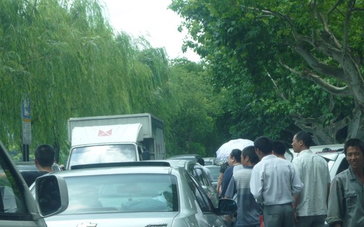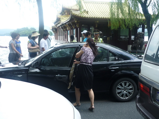 那一天,周的車載我們從上海出發到西湖,想到樓外樓吃醋魚,時間不過上午11點,圍繞著西湖的二線道已經人車洶湧,樓外樓前停車場早已滿位,正當我們掉頭離去,這時一部想從對面車道左轉進樓外樓停車場的黑色轎車執意停在路口,堵住了往來車輛。如此眾車陪我等的霸道行逕,悍啊!