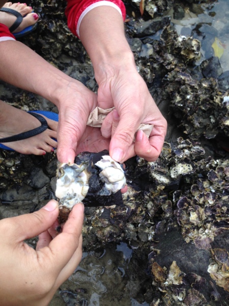 黃昏時分,大小兩船下錨,大家迫不及待搶搭小船上岸,在岸邊扮起蚵男蚵女,現採鮮嚐,蚵雖小鮮味足。年輕一代夜上甲板,綁餌垂釣,一下子兩魚上鈎,又要加菜了。