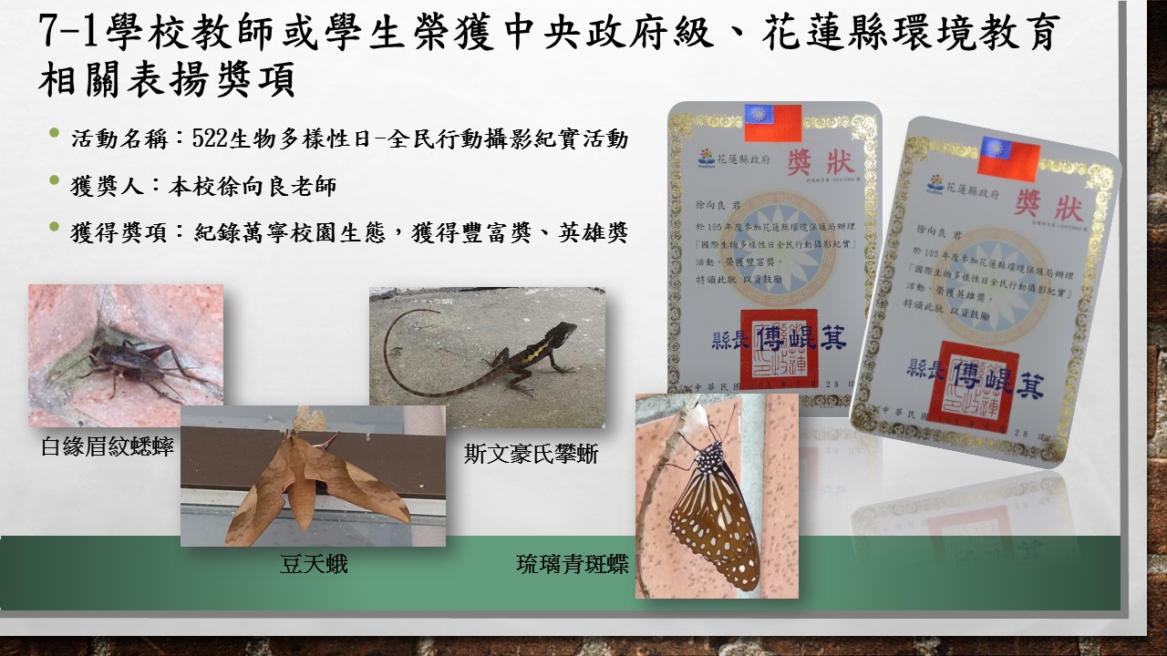 7-1學校教師或學生榮獲中央政府級、花蓮縣環境教育相關表揚獎項