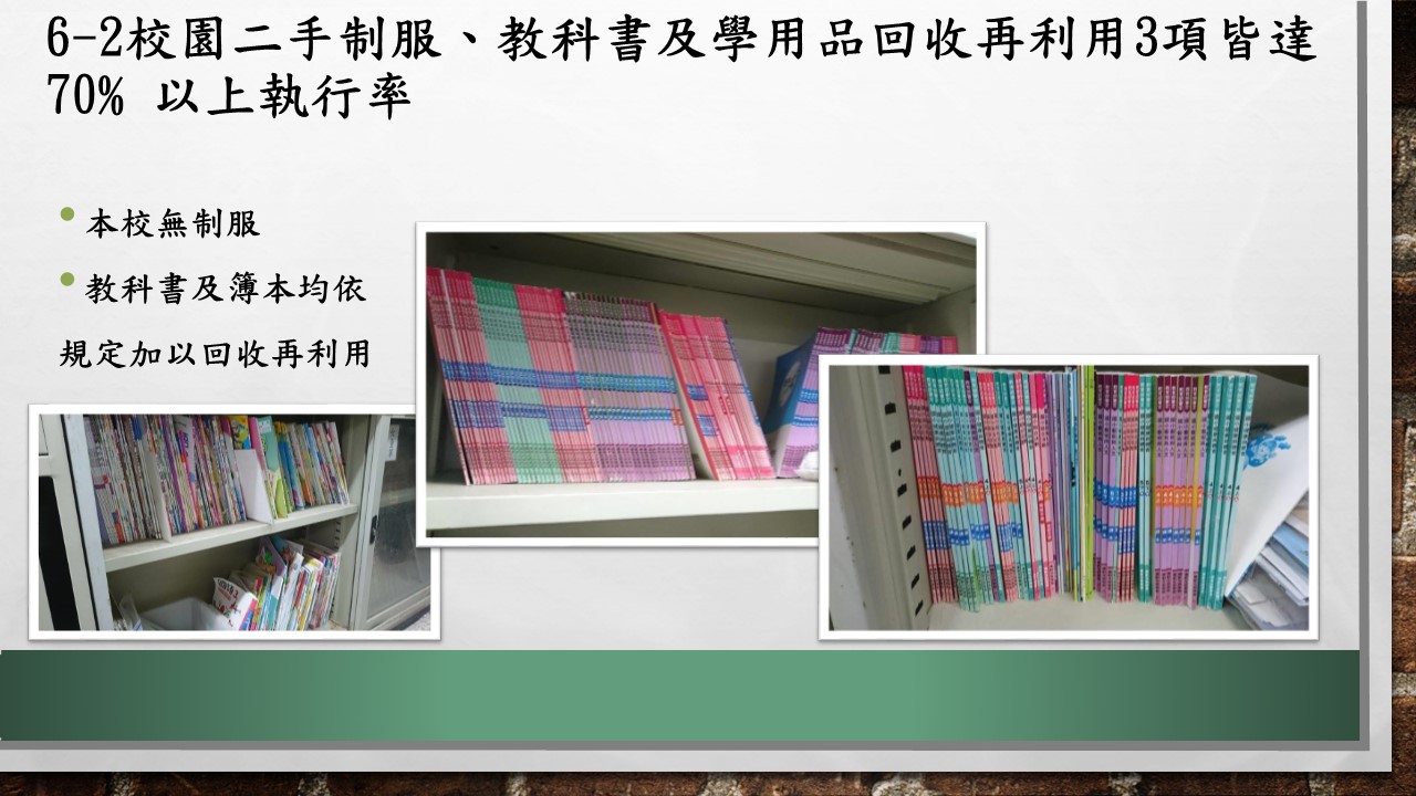6-2校園二手制服、教科書及學用品回收再利用3項皆達70﹪以上執行率