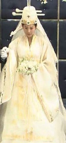 外加一件禮服 , 設計有如 ” 明成皇后 ” 或 ” 宮 ” 的女主角結婚時所穿的宮中大禮服 , 華麗端莊 , 具宮庭氣派 , 雖加上大量金色花紋 , 倒沒有一絲俗氣 , 反似童話故事中的公主結婚禮服。