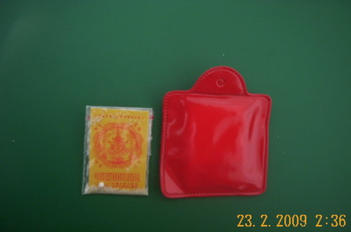 內含上寂下性法師(演性法師)加持之咒輪(三合一)、金光明沙、舍利石。 由於三張咒輪佩帶功德殊勝,蒙師父慈悲,特將三張合印成一小張,方便攜帶。