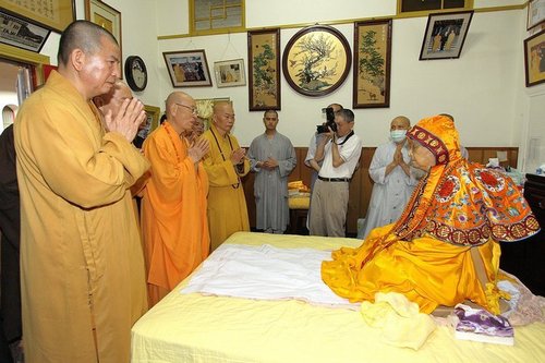 觀音老人,悟明長老圓寂後,穿上法衣及坐缸莊嚴法相
