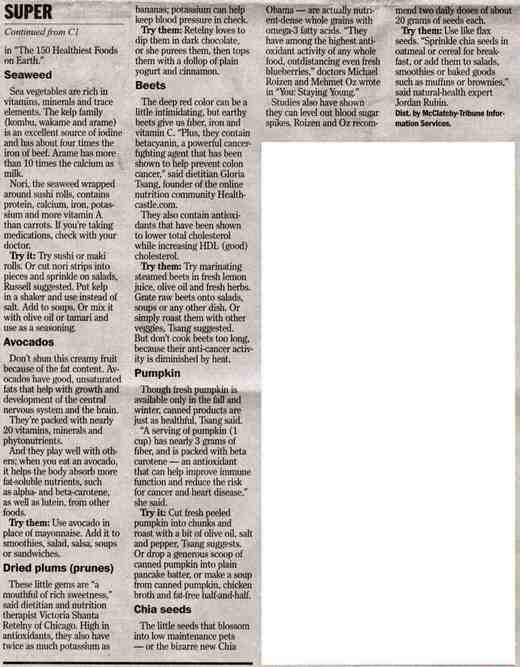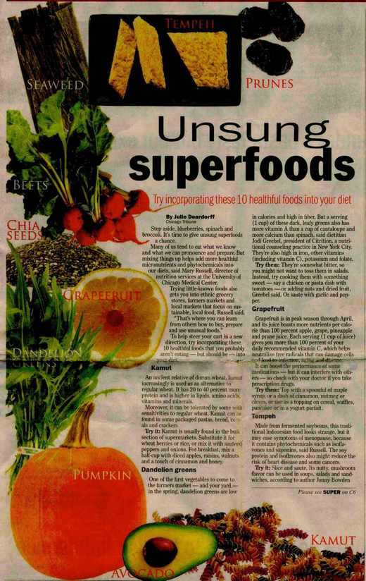 1. Kamut 2. Dandelion greens 3. Grapefruit 4. Tempeh 5. Seaweed 6. Avocados 7. Dried Plums (prunes) 8. Beets 9. Pumpkin 10. Chia seeds