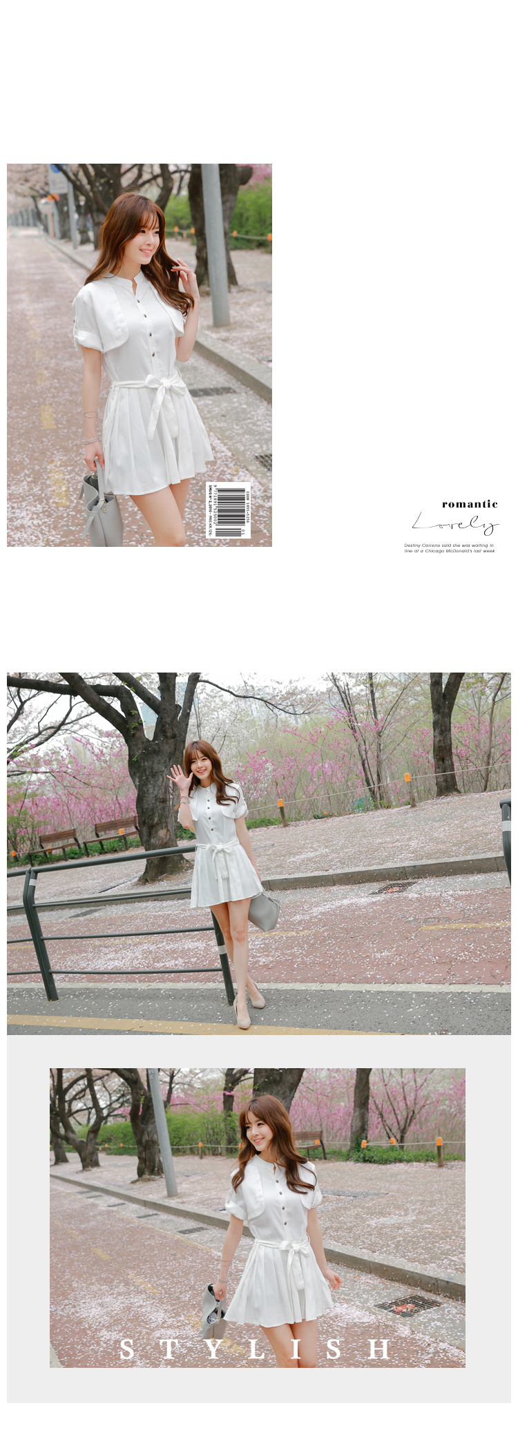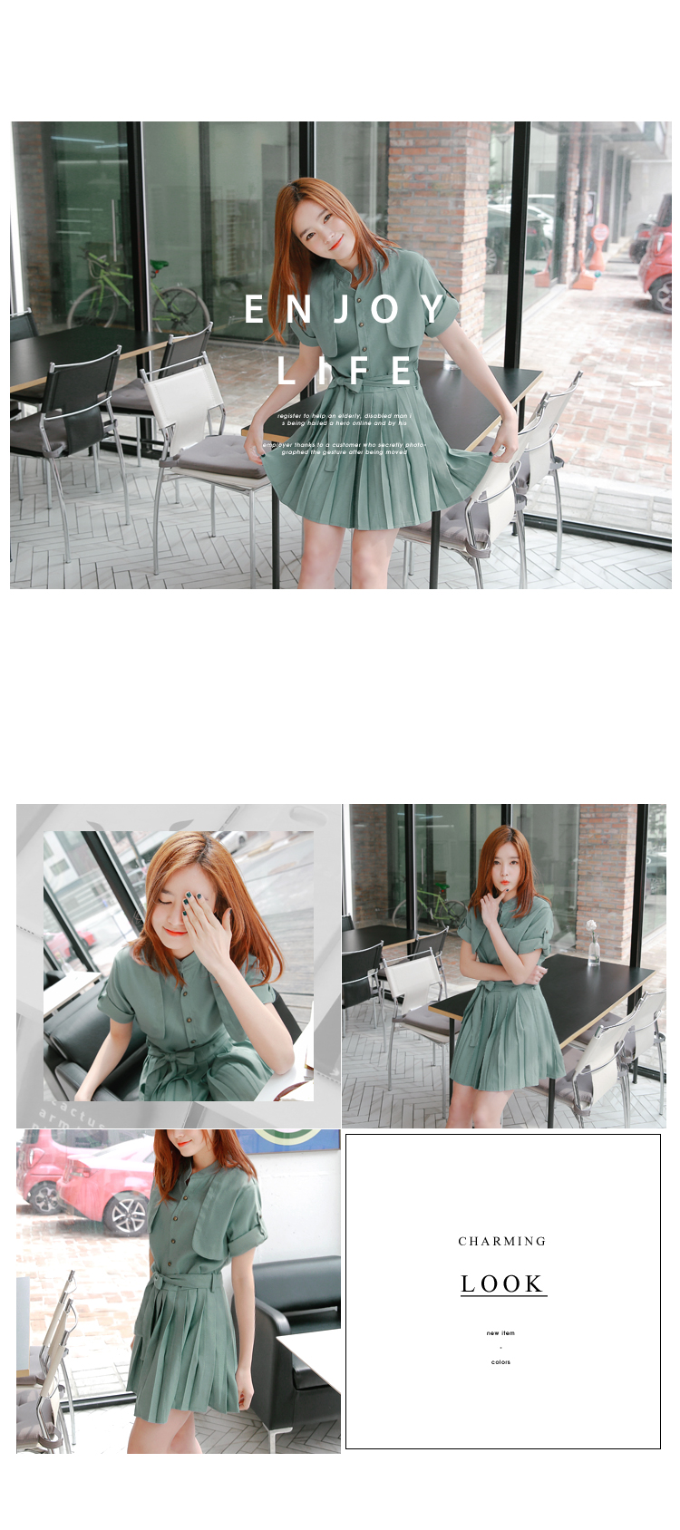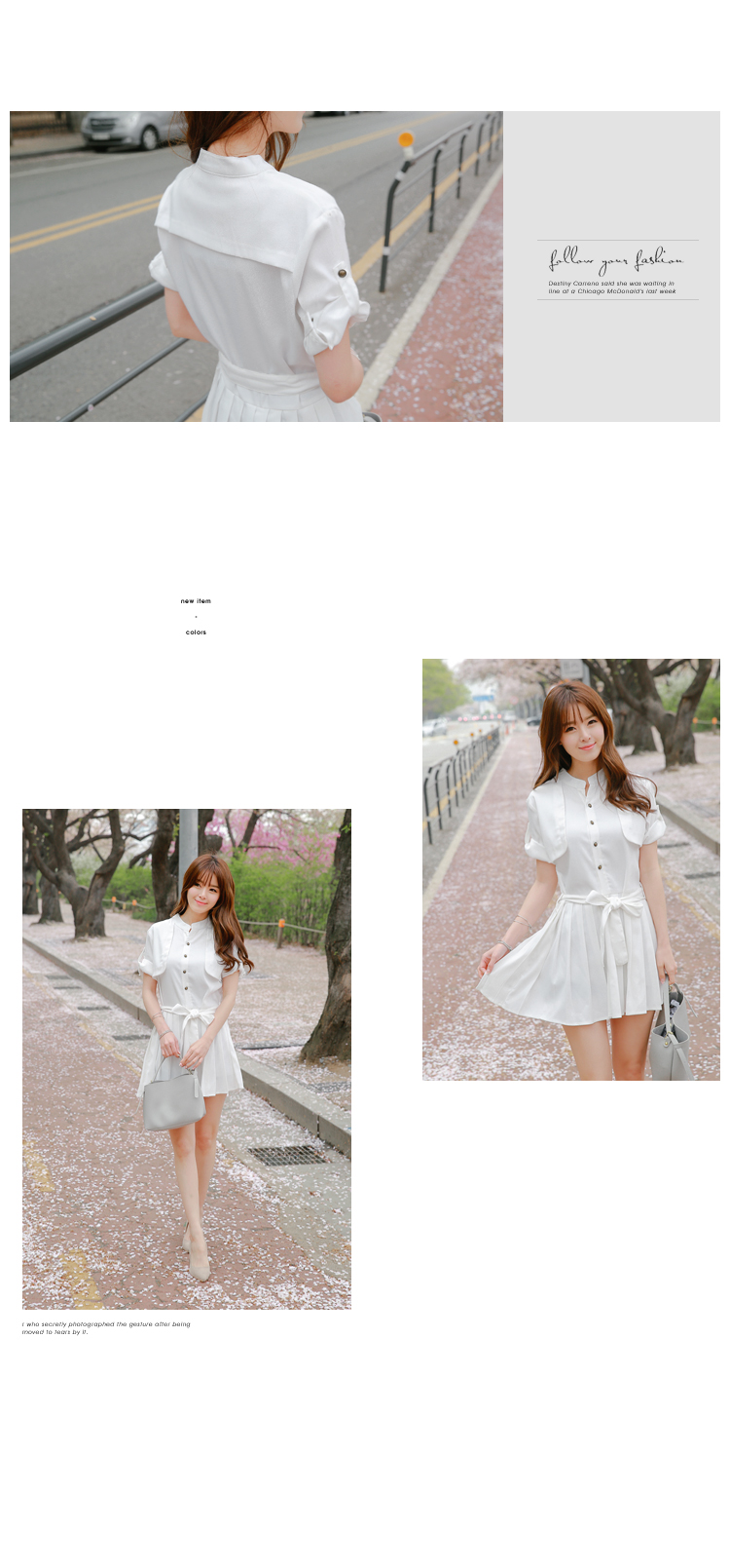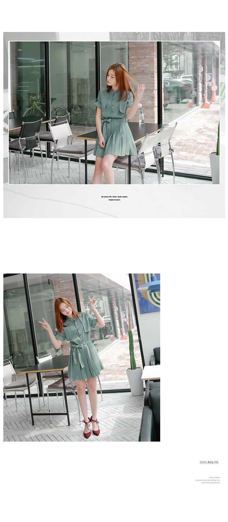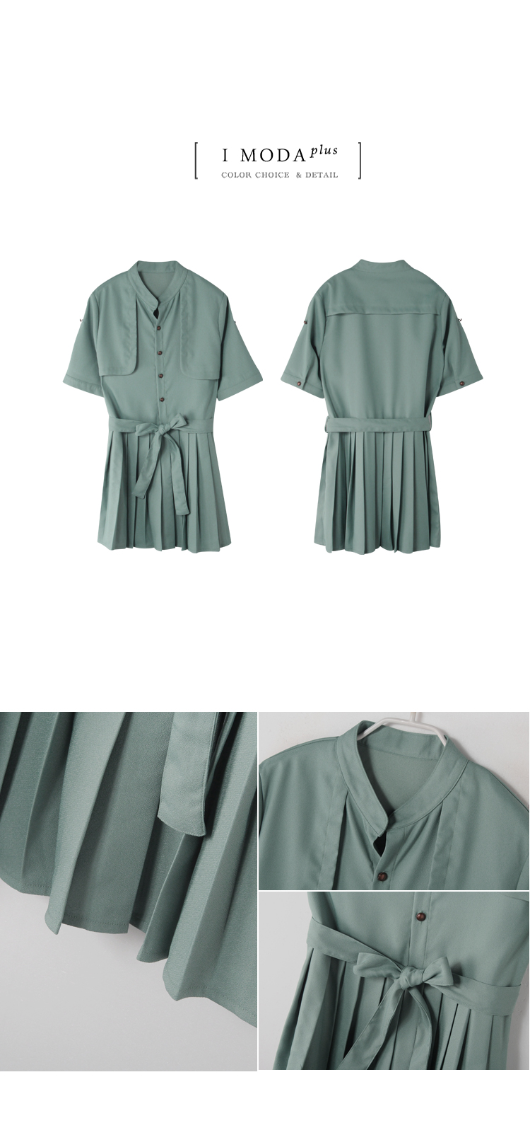0617新品 素色半開襟反褶釦短袖綁帶百褶襯衫洋裝.2色