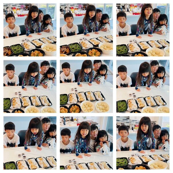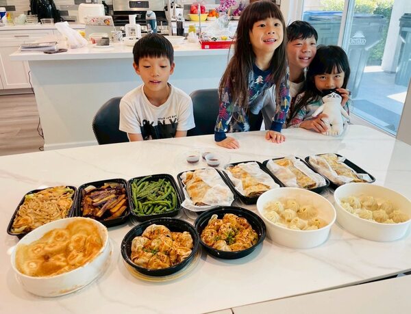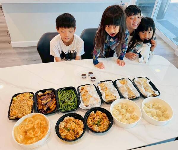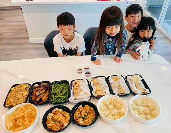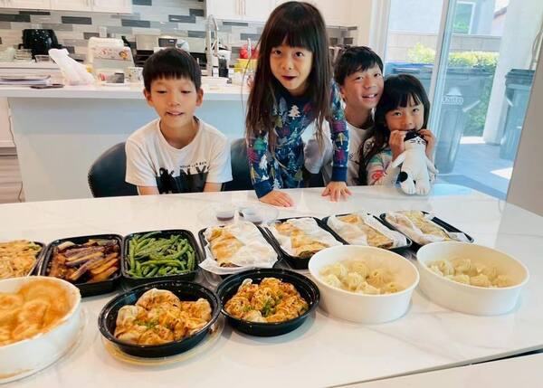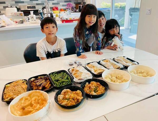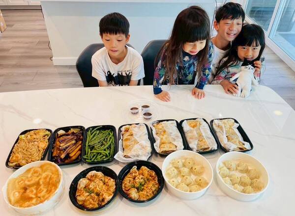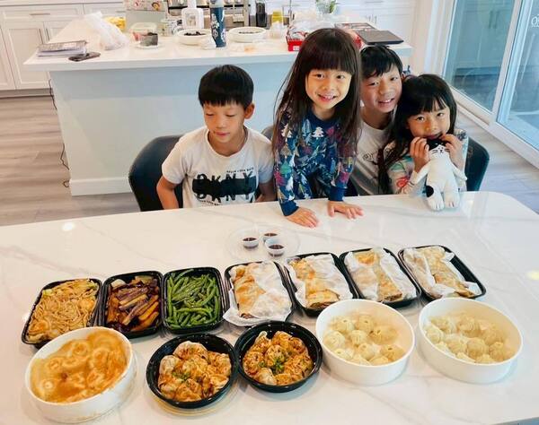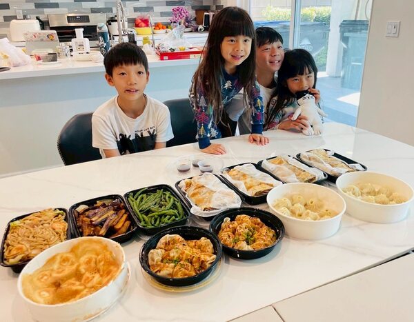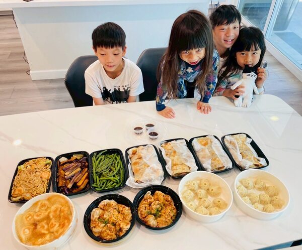 洛杉磯小隊3+1成員面對滿桌牛肉捲餅小籠包抄手大蝦炒麵煎餃食指大動躍躍欲試