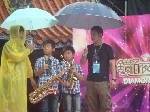 2011后里美冠樂器薩克斯風兄弟二人組參加鑚石夜總會海選才藝達人幕後花絮.來自台中市后里美冠樂器薩克斯風學生參加知名主持人.利菁.黃國倫.小鍾主持的鑽石夜總會.哥哥吳柏均.弟弟吳凱翔.在錄影前.排練時下著大雨.大家還擔心會影響晚上正式錄影.製作人.說安啦.在參百多年歷史古蹟聖和宮媽祖廟前錄影.媽祖會保佑錄影一切平順的.排練演奏曲是新不了情.電視撥放2011.07.24晚上8點--10點台視鑽石夜總會