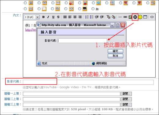 ,在popup視窗貼上影音代碼即可。或者~ 選擇2. 在影音欄位的文字框中,直接貼上影音代碼即可。