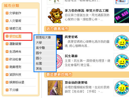 城市部分將「學校社團」從情感交流的次分類下拉出來成為主分類。