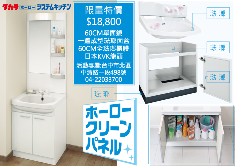 限量特價 $18,80060cm單面鏡60cm一體成型琺瑯面盆60cm全琺瑯收納浴櫃日本KVK龍頭活動專屬:台中市北區中清路一段498號咨詢專線:04-22033700#琺瑯廚具 #takarastandard #日本廚具 #琺瑯浴櫃 #收納 #寶廚 #清潔 #店樣出清 #免費規劃#KVK龍頭 #特價