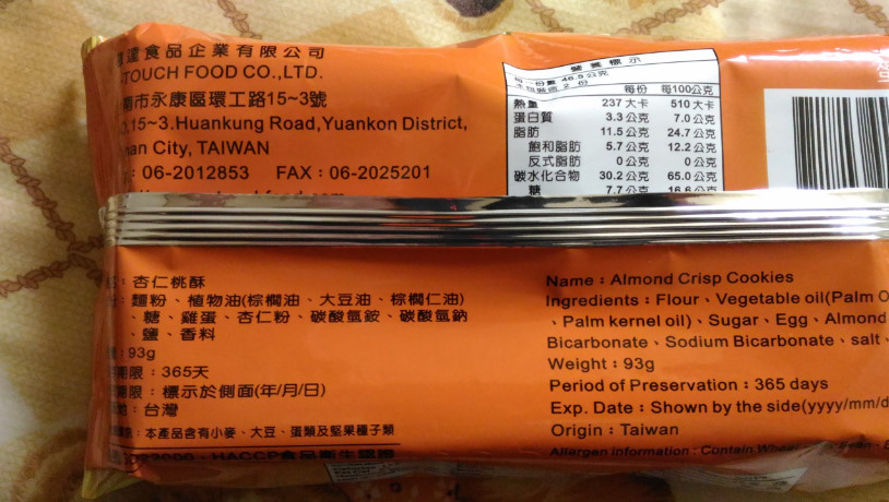 1.杏仁桃酥 一盒20元(小北百貨) 一包裡面有4大塊 每一包93公克 兩大塊熱量約237大卡