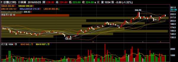 F-亞德 1590 機械零件:短線量能與籌碼表現的相當不錯,雖然前方有反轉K棒但量並不多,有機會滾量向上突破。