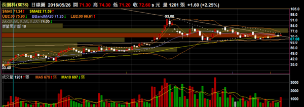 長園科 8038 化工指標:量能持續萎縮出現三角收斂,近期有機會出現上或下的表態。