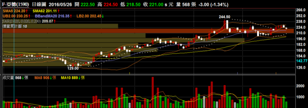 F-亞德 1590 機械零件:短線量能與籌碼表現的相當不錯,雖然前方有反轉K棒但量並不多,有機會滾量向上突破。