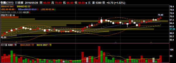 敬鵬 2355 印刷電路:開盤出量創高,量能也預期達到了五千左右,有機會站穩突破短多持續。