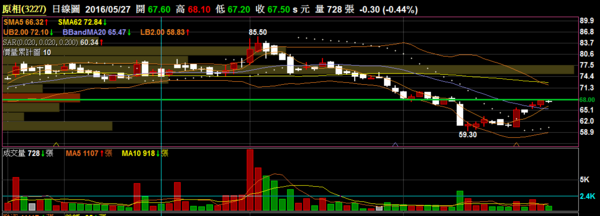 〔測試〕原相 3227 IC設計:近期小反彈無量,目前在5/12出量黑K棒上方與小盤整區,有機會再此見到壓力。