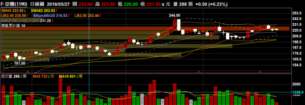 F-亞德 1590 機械零件:短線量能與籌碼表現的相當不錯,雖然前方有反轉K棒但量並不多,有機會滾量向上突破。