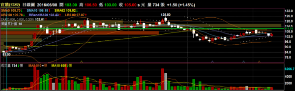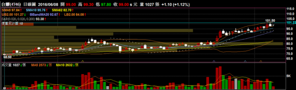 台耀 4746 化工指標:創高後遇到百元關卡的壓力,但目前趨勢未改變短多持續。
