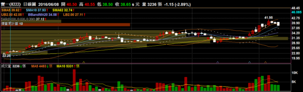寶一 8222 飛機零組件:昨日強勢洗盤後今日再次出量強勢創高鎖漲停,短多持續。