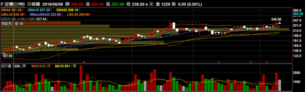 F-亞德 1590 機械零件:帶量強勢創高後拉回,要注意今日收在大量區之下,要注意是否有假突破的問題。