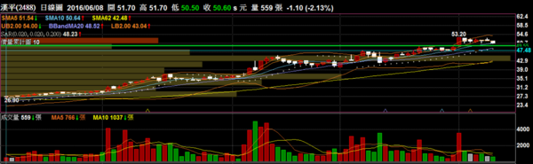漢平 2488 音響設備:支撐線上移來到6/1低點,出量強勢創高短多持續。