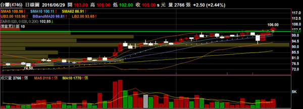 台耀 4746 化工:重新突破盤整區間,百元關卡的壓力目前轉為支撐。