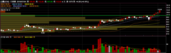 台耀 4746 化工:重新突破盤整區間,百元關卡的壓力目前轉為支撐。