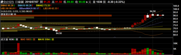 鑽全 1527 手工具機:短線量能表現得相當不錯,目前在高檔震盪整理有機會繼續向上突破,但要注意目前接近百元關卡。