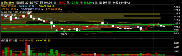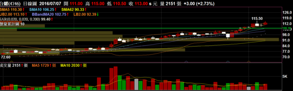 台耀 4746 化工:重新突破盤整區間,百元關卡的壓力目前轉為支撐。