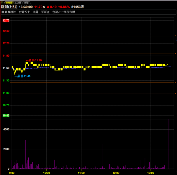 〔隔日沖測試、結束操作〕群創 3481 TFT面板:早盤回測下方支撐後拉回,隨盤勢小出量向上,力道減緩後即獲利了結。