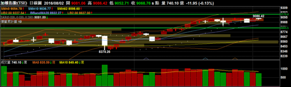 加權指數 TSE:今日量能持續萎縮並且高低點振幅只有34點左右,而日常ATR約為74.61點左右,目前量能萎縮要突破7/25高點相對較難,持續盤整機率較高,OTC相對弱於大盤的現象一直存在,但外資大買權值股拉指數還是持續中因此未出現反轉訊號,不建議做單壓空單的部位,當沖角度短多長多。