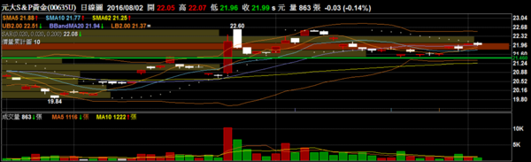 元大S&P黃金 00635U:目前回測前四個月的壓力區,並且KD即將出現低檔黃金交叉。