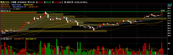 雙鴻 3324 散熱模組:創下歷史新高後並沒有強勢上攻力道,持續來回測91.5原歷史新高位子,需要注意是否有假突破疑慮。