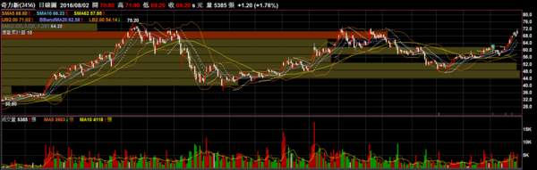 找買點 奇力新 2456 被動元件:近期短線急漲來到歷史新高附近,籌碼面與量能都表現得相當不錯,若整理一個禮拜後再帶量突破較優。 接近歷史新高並走勢較佳:大立光 3008 手機零組件、慶騰45...
