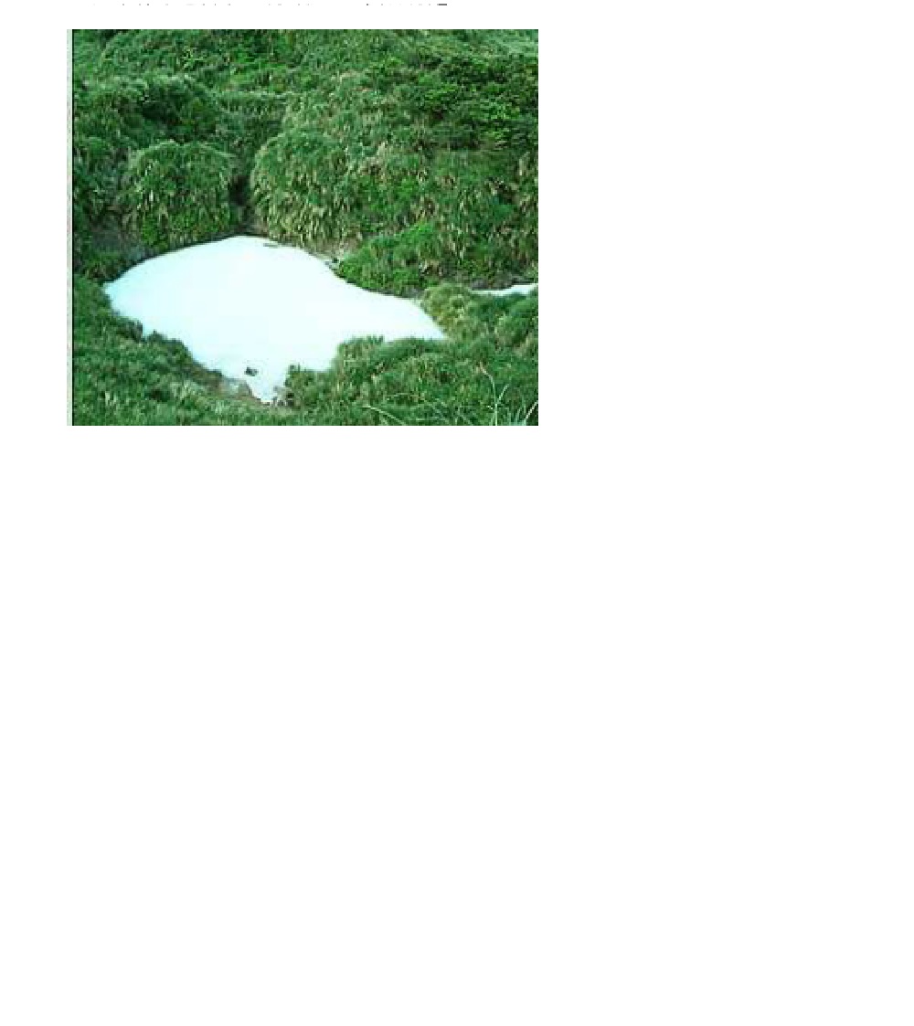 Lengshikeng ( 冷水坑)categorized as a cold spring, its temperature is appropriate for this kind of bacterium to survive. Sulfure Chi (硫磺芝) could secrete(分泌) jelly like material, and combined with sulfur, then dissociate sulfur crystals. Finally they are aggregated and formed as the white color precipitants. That’s the reason why to make the lake appear as milky white color. And the swamp at the bottom of milky lake will be sprayed with the gaseous sulfur compound. The ionized sulfur particle will make the lake water turbid.