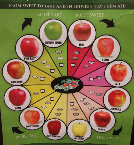(上圖說明)依順時針方向,甜度最高的是富士蘋果,然後是Sonya、Gala、Jonaglod、Camed、GoldenDelicious,接著是酸的口感,從有一點酸開始,依序是Red delicious、Honey Crisp、Rome、Braeburn、Pink Lady、最酸的是GrannySmith。圖中切片是指可以直接鮮吃,畫派的是指可以拿來烤蘋果派,有鍋爐的是指可以用來煮成蘋果醬。所以,你可以發現,並不是每一種蘋果都可以做蘋果醬(像Gala、Red Delicous這兩種我們常吃的蘋果就不適合煮或烤),而比較酸的蘋果(像: Rome)就不是鮮吃的,只適合用來作派或醬。