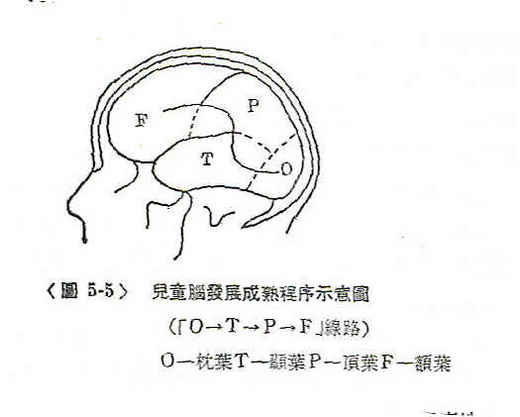 兒童腦的發展成熟問題是研究兒童發展中心問題之一‧若以兒童的腦皮質細胞的電活動頻率基本上達到α波範圍與θ波基本上消失做為成熟的指標,則兒童的枕葉到9歲基本上成熟,顳葉到11歲基本上成熟,而全皮質(指枕葉、顳葉與頂葉而言)則到13歲才基本成熟‧可見兒童大腦各區的成熟程序是由後往前分別進行的‧其程序是枕葉(O)→顳葉(T)→頂葉(P)→額葉(F)‧自O至T再至P這一線路已被證實,而自P至F這段線路是根據關於兒童的腦的組織學材料的一種設想,這條「O→T→P→F」線路是正常兒童的腦逐漸發展至成人的必然規律‧許多白痴與癡愚兒童的腦的發展則在這線路的始端(O)前即已中斷,而遲鈍兒童的發展則可能在某個轉折部份中斷‧