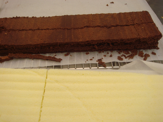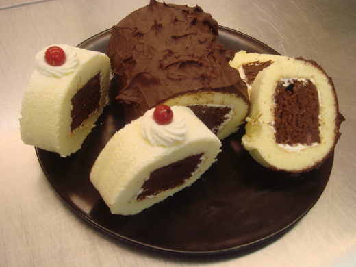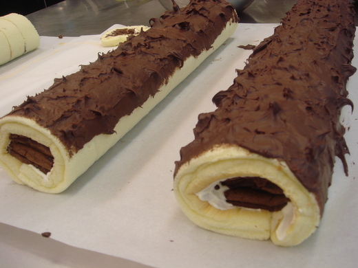 B 將香草蛋糕切三等分分別抹上香堤醬後 把A項的巧克力長條 當成夾心捲成蛋糕捲(三捲)。